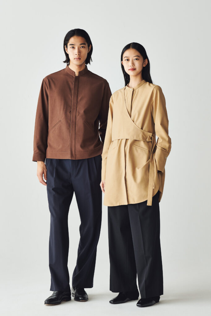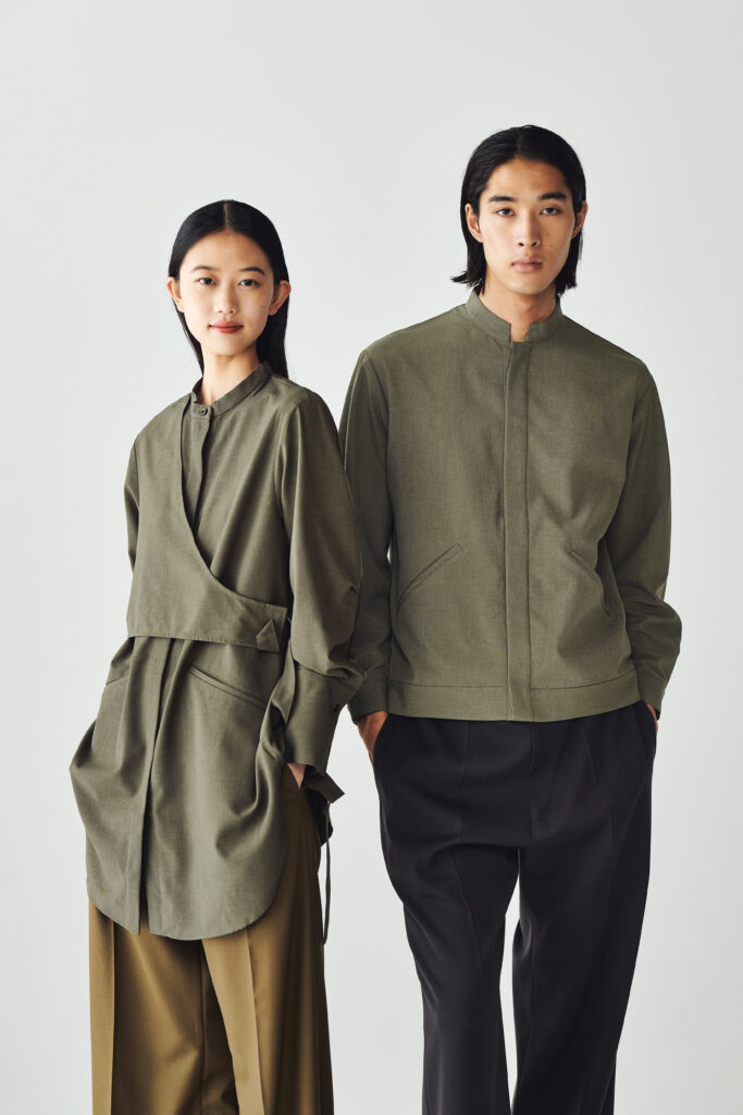 メンズはシャツとブルゾンをミックスさせたトップスをボタンが隠れる比翼仕立てに。そしてウイメンズは、アシンメトリーなレイヤードデザインと長さのあるカフスがポイントのバンドカラーシャツ。トップメゾンの空気感を纏ったようなミニマルでスタイリッシュなユニフォームが誕生しました。インテリアからかけ離れないよう、白やベージュ、オリーブといったアースカラーで調和を図っています。