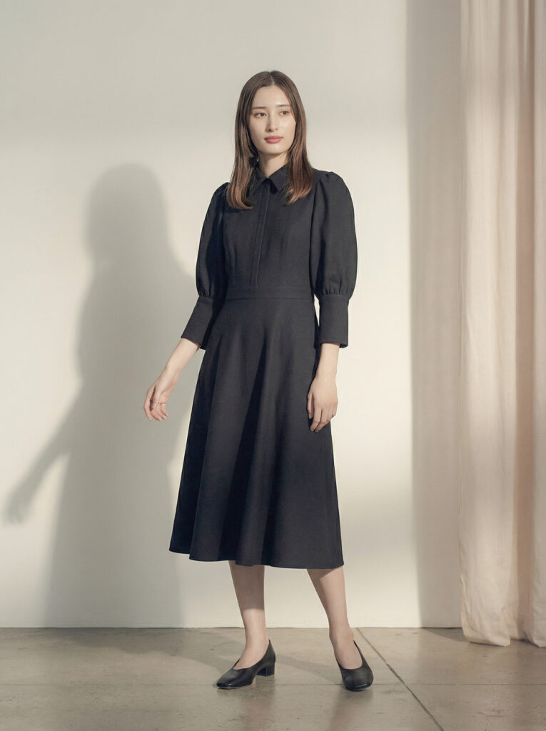 肩にボリュームを出したパワーショルダーでトレンドを取り入れながらも、Aラインのシルエットと落ち感のある生地で仕立てることで、ショップインテリアにもマッチするエレガントさを演出しています。