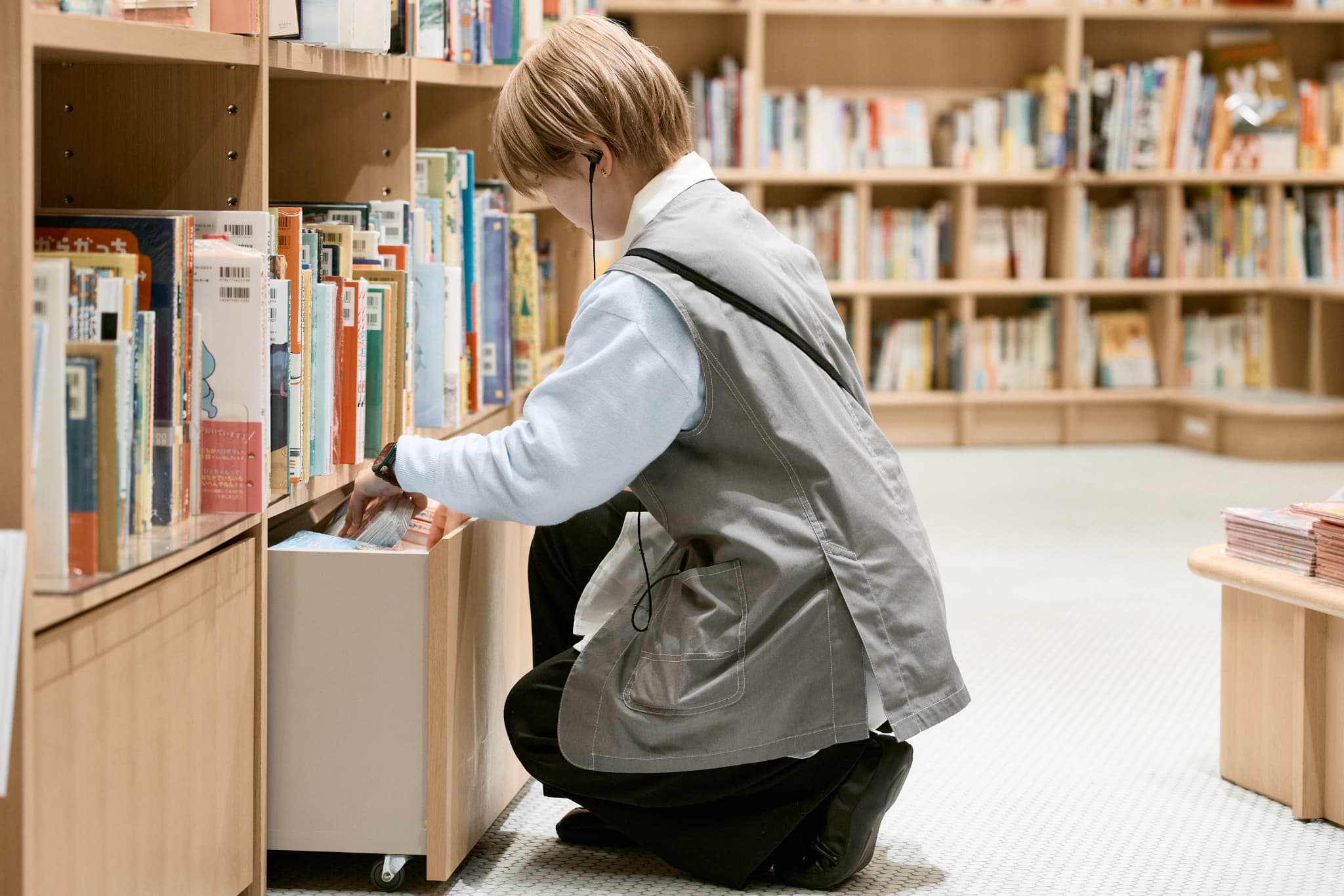 BUNKITSU TOKYOのユニフォームづくりは、「実は本屋の仕事は、かなり体を使う」という現場の実感から始まりました。棚の上と下を何度も行き来し、しゃがんでは立ち上がり、店内を一日中歩き回る。気づけば1日で3万歩近くになることもあるそうです。
