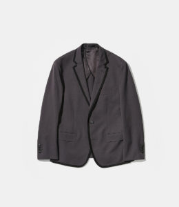 チャコールグレーに、ブラックのパイピングがアクセントになった一着。シャープなラインが全体を引き締め、端正な印象を与えます。ホテルやブライダルの現場など、上質さを求められる空間に合うようお作りしました。