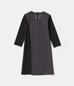飲食店スタッフ用ワンピース。落ち着いた配色の切り替えデザインが、動きのある印象を与えながらも清潔感を保ちます。深めのVネックは顔まわりをすっきりと見せ、上質な素材感が上品さを演出。サービスシーンにふさわしい、知性と信頼感を兼ね備えた一着です。