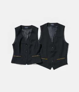 エアラインのスタッフ用ベスト。ポケットに走るイエローのラインがブランドカラーを象徴し、機能性と洗練を両立。上質な黒の生地が信頼感と品格を演出する。