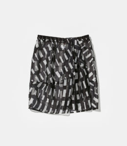 透け感のあるオーガンジー素材が軽やかな印象を与える、ジュエリーショップ店員用スカート。幾何学模様が光の反射を受けて上品に揺れ、展示されるジュエリーのきらめきと調和。エレガンスと個性を兼ね備えた一枚。