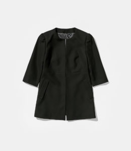 上品なノーカラーデザインが印象的な七分袖ジャケット。肩に控えめなタックを入れ、自然な立体感を添えています。やや長めの丈が落ち着きを感じさせつつ、動きやすさにも配慮。