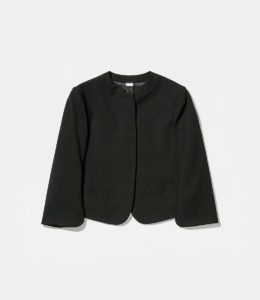 丸みのあるノーカラーがやさしい印象をつくる、ブライダルサロン用ジャケット。フロントをすっきりとまとめたデザインが、品よく清潔感を引き立てます。短めの丈でワンピースやスカートともバランスが取りやすいです。