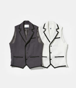ホテルやレストランでのフォーマルシーンに映える、コントラストの効いたベスト。黒と白、二色のバリエーションが空間や役割に合わせた着こなしを可能に。端正なデザインの中に、洗練と華やかさが共存する一着。