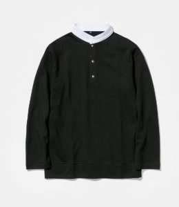 柔らかなカットソー生地に、白のスタンドカラーを合わせたプルオーバーシャツ。カジュアルな着心地の中に、凛とした印象を添える一枚です。比翼仕立てのスナップボタンが控えめなアクセントとなり、フォーマルすぎず、それでいて整った佇まいを演出。