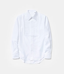 上質なコットン素材を使用した、ハリのある質感のドレスシャツ。胸元には細かなピンタックをあしらい、シンプルな中に上品なアクセントを加えています。やや広めの襟とすっきりとしたシルエットで、フォーマルにもカジュアルにも対応。ジャケットのインにも、一枚でも品よくまとまります。
