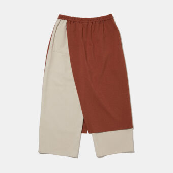リゾートホテルのレストランユニフォームとして仕立てた、サロン一体型のラップパンツ。パンツの上にサロンを重ねたようなデザインが、動きやすさと上品さを両立させます。生地を変えることで、フォーマル感を演出することも可能。