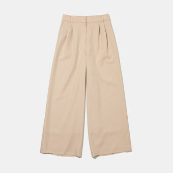 化粧品メーカーの春夏ユニフォームとして仕立てた、軽やかなワイドパンツ。さらりとした肌触りの生地が涼やかに揺れ、清潔感と上品さを両立します。深めのタックが生む縦のラインが脚を美しく見せ、動くたびに柔らかな陰影を描きます。