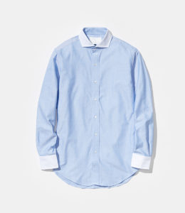 淡いブルーに白の襟とカフスを配した、クラシックで清潔感のある一枚。きちんと感の中に、爽やかな軽やかさが漂います。ホテルやブライダルシーンなど、フォーマルな空間にも自然に馴染み、上品な印象を添えるシャツ。