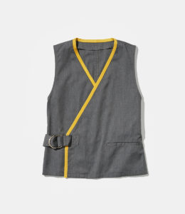 和の要素をモダンに取り入れたラップベスト。襟ぐりと前立てのイエローの縁取りが印象的で、空間を華やかに引き立てる。飲食店や旅館など、おもてなしの場にふさわしい一着。