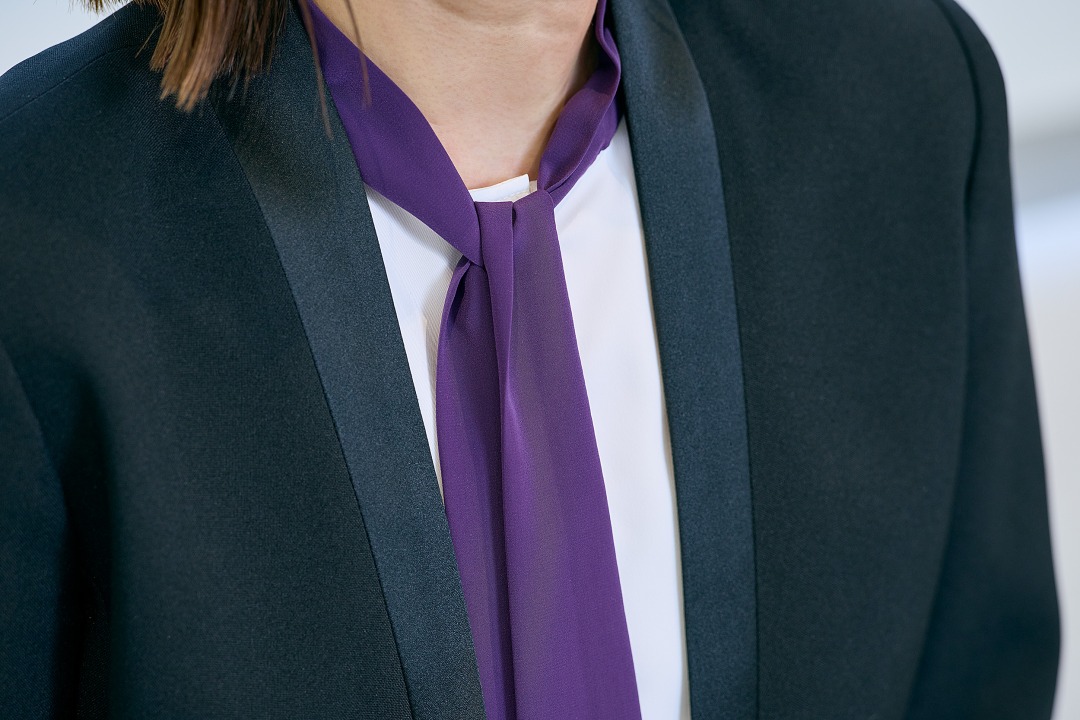 「モイスティーヌのブランドカラーである紫は、お客様の目に留まるよう、顔まわりに取り入れていただきました。このタイは真結びするだけで華やかさが加わります。スカーフを巻くのが苦手な方にもご好評をいただいています」