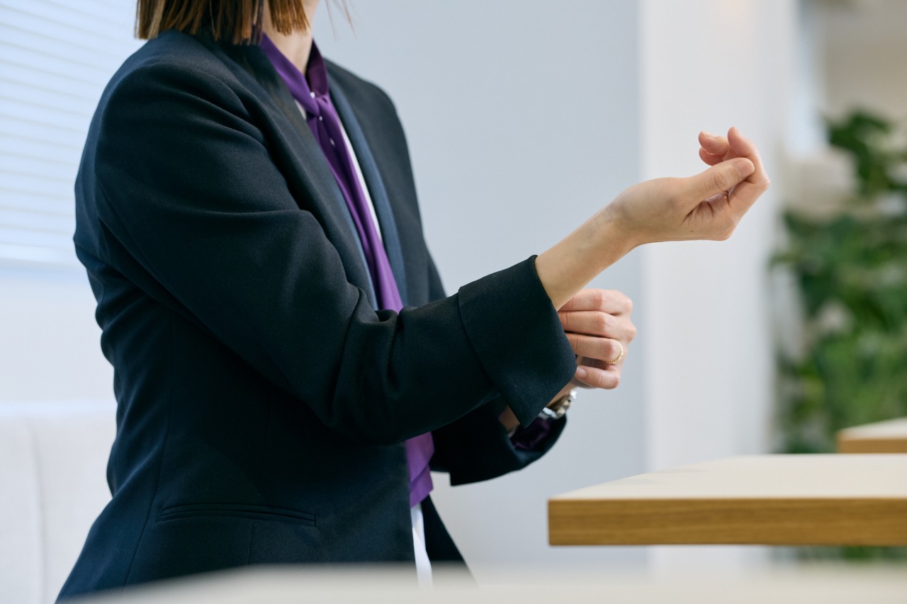 「着用したままでも接客が行えるよう、袖口は折り返しができる仕様になっています。手を動かしても袖が落ちてくることがなく、接客中のストレスもありません」
