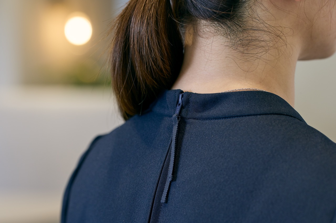 着替えの際にメイクがつかないよう、前開きの設計を採用。自宅で洗え、ノーアイロンでもシワになりにくい素材を選ぶことで、常に清潔感のある状態でお客様の前に立てるよう配慮しています。